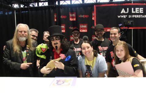 Having finished up with his interviews, Svengoolie and crew headed just outside Flashback Weekend‘s main hall to his designated signing spot. It was finally time to greet his patient fans and, considering how long many of them had been standing out there, not a moment too soon. There were three lines (one for Flashback VIP badge carriers) and, despite some initial confusion, went smoothly overall. As with C2E2 a few months back, my job was to take photos of Sven with his fans; using their own cameras. Producer, Jim Roche, fired up the crowd while dispensing some of the ground rules for meeting MeTV’s Saturday night sensation.