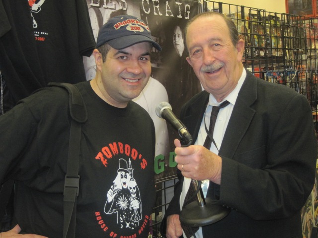 The 2010 Horrorhound Indianapolis Convention was a definite zombie paradise! On hand were plenty of representatives from Romero’s DAWN OF THE DEAD and DAY OF THE DEAD films. There was only one in attendance from his original, 1968 NIGHT OF THE LIVING DEAD and that was Charles Craig. Mr. Craig played the radio announcer in the horror classic (as well as a zombie extra) and was happy to pose with us using an actual microphone as a prop. He was a very nice guy and seemed genuinely surprised at the attention he received. I just felt bad that he was stuck handling money transactions while his “assistant” snoozed away!