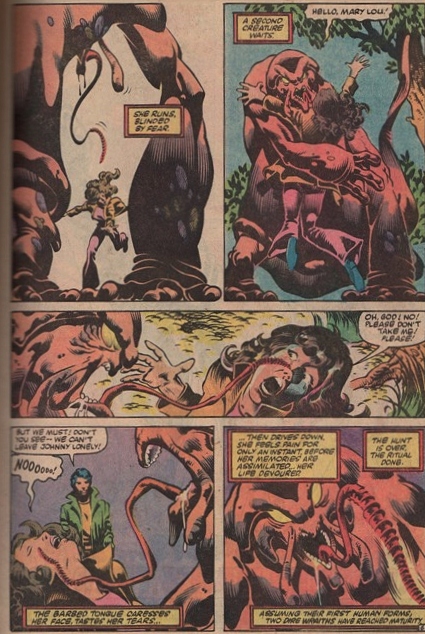While the first 46 issues issues were a definite nod to science fiction, the comic then took a major turn into horror. Previously, readers had only seen the male wraiths who can mimic their foes in appearance without killing them.  By issue 47 we are introduced to the female members of their society who not only look more gruesome but are far more ruthless. Tired at watching their wraith brothers fail time and again, the gals decide to take matters into their own hands. Reliant upon sorcery as opposed to the male’s science they decide the first order of business is to wipe out the boys all together.
