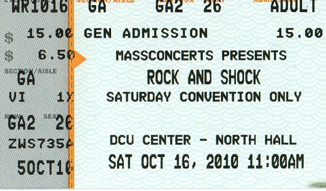 On Saturday morning we descended upon the DCU Center in Worcester, Massachusetts approximately a half hour before the “Rock & Shock” convention was to begin. While observing the rather interesting looking attendees, the doors soon opened and we anxiously entered the main hall. It took some time for our eyes to adjust to the kaleidoscope of sights before us, so that we could determine which direction we should head. As mentioned during my coverage of Horrorhound, it is always a good idea to pre-plan your convention experience to ensure that you get the very most out of it. David had wisely printed out an itinerary that listed all the celebrities we wanted to meet by order of priority.