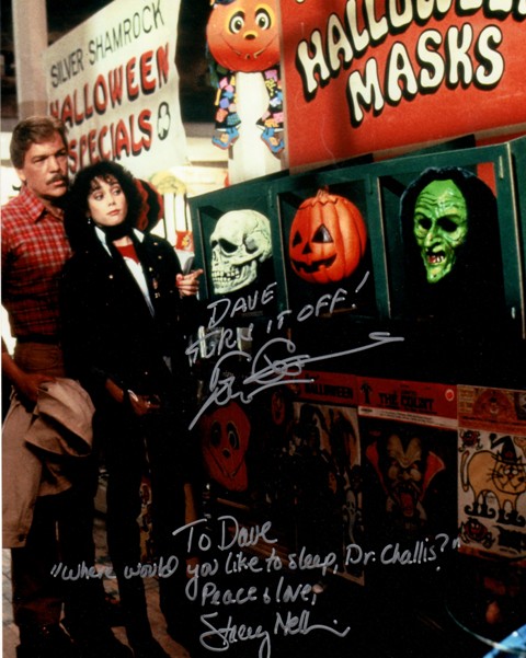 Atkins gets a “10” on the TFBTD celebrity Meeting Scale for having lots of enthusiasm, genuinely making the fans feel special, offering his own props for photos, and for selling hilarious shirts. I was so pleased with our Friday meeting, we ended up paying him another visit on Sunday – this time I had him sign a HALLOWEEN III still and pose with co-star, Stacey Nelkin.