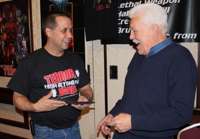 He got a kick out of our TERROR FROM BEYOND THE DAVES shirts and, throughout the weekend, whenever we walked past his table he’d smile and yell – “Look! There’s a Dave!” Atkins had some amusing shirts of his own for sale and David picked one up for Richard, our young computer wiz kid!