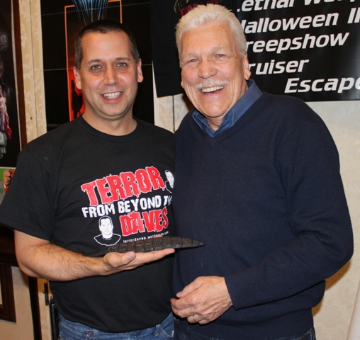 We all laughed as I said, “Thank GOD your weird,” and had him sign both a poster of THE FOG as well as one of his own photos. He happily allowed us to pose with a replica of a “creep” from NIGHT OF THE CREEPS – another fun horror film from the 1980’s. The black, slug-like creature, famous for animating the dead, was sitting on his table and perfect for a photo op.