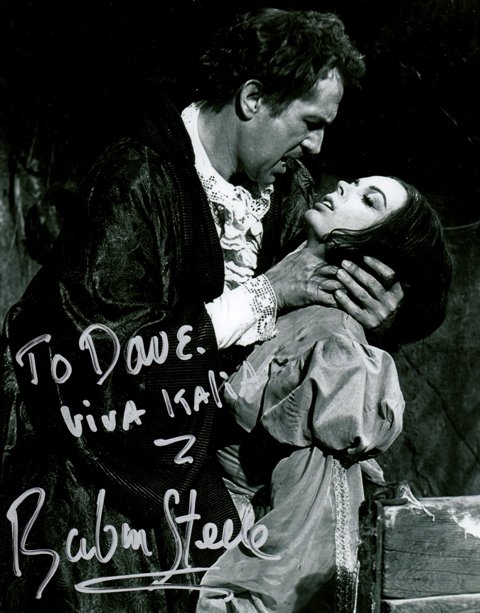 I chose to have her sign a picture from her own collection of 8×10’s. Prior to arriving, I had anticipated having her sign a BLACK SUNDAY photo. I would end up choosing a B&W still from THE PIT AND THE PENDULUM that included her co-star, Vincent Price. According to IMDB, Price injured Steele while throttling her in this scene….thought Steele would end up being a good sport about it.