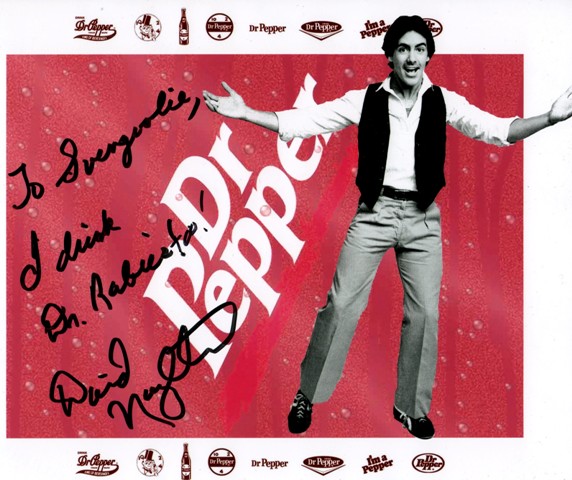 Our “Photo of the Month” is actually an autographed picture this time, thanks to our pal Dave Fuentes of the “Terror from beyond the Daves” website that he does along with Dave Albaugh. Dave went to a convention, where he met David Naughton- star of “An American Werewolf in London” – and those “I’m a Pepper/You’re a Pepper” TV commercials from the 70s. He told David about the old commercial parody we did years ago at WFLD where I combined the soft drink commercial with his werewolf transformation from the movie. Mr. Naughton said he had indeed heard of me, and thought the parody idea was “genius” (oh, now, you’re making me blush!). He also signed the below autographed picture for me, indicating that he drinks Dr. Rabies, too! He also told Dave to give me his congratulations on our program going national!