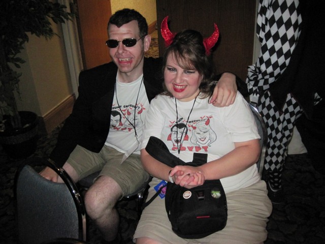 Horror Host “summer fashion” continued with the arrival of The Count and Countess Gregula – Gregula sporting a rather unique vampire look with a T-shirt, overcoat, and shorts. Here’s an interesting tidbit; not long after FRIGHT NIGHT, Gregula was cast for a role in a new NBC Fall series called “The Playboy Club.” I can’t help but think that the casting director may have seen one of these shots from the DARK STAR event before making their decision!