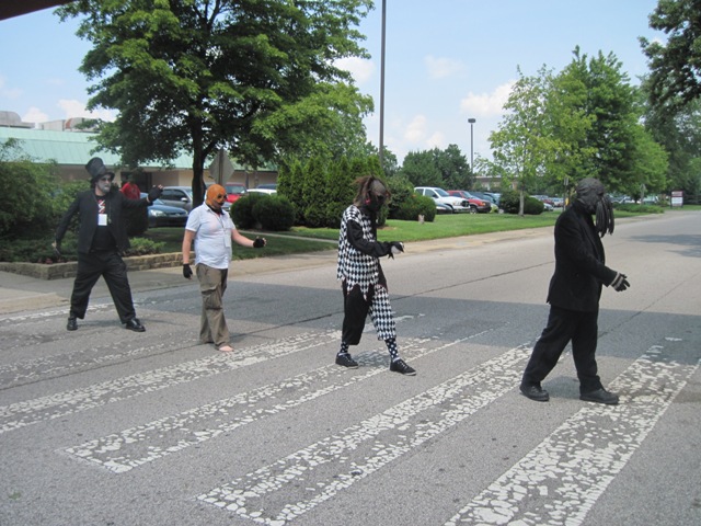 As the event ended, everyone left with big smiles on their faces (probably equaling the hang-overs they’d have the next day) and it was clear that, despite recently losing their regular performing venue, Atomic Age Cinema is far from beaten. In the spirit of their new-found solidarity, they would not be confined to a booth at FRIGHT NIGHT and moved freely about the entire weekend. Everywhere they went they brought laughs and smiles at a convention that desperately needed it. This was further illustrated on the last day of the convention when, eager to take advantage of the familiar looking walkway that joined the two buildings of the hotel together, they decided to re-enact the cover of the Beatles’ “Abbey Road.”