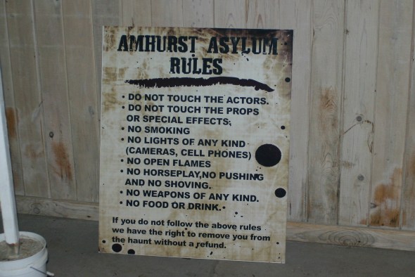 Learning my lesson from Sven’s now infamous J.J. Blinkers appearance (which you can revisit HERE), I decided to leave early and arrived at the attraction well before dark. The “Asylum” appeared to be an abandoned stable, once used for horses. I waited in my car with a couple of other early birds while watching a few bloody actors go outside to use the…uh…facilities.
