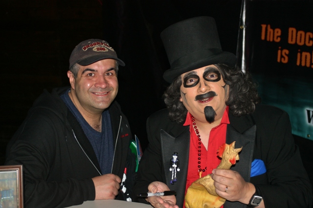 I walked up and said hi to Svengoolie who is always a pleasure to meet. Unable to have him sign anything at JJ Blinkers, I brought a bunch of stuff tonight but assured him that, if he couldn’t get to all of it, I’d surely catch him again this month at another event. “No, that’s fine!” he said and signed everything. I picked up a couple of new glow-in-the-dark Sven T-Shirts for me and the “other Dave” (David Albaugh) so I could hand deliver it to him in a couple weeks when I fly up to Rhode Island to see him. Sven asked me to say “hello” to him and I mentioned how excited David was to be able to see his show from his own New England home this very night. “That’s right!” said Sven. “That is really great to hear.” I then joked that David was considering NOT watching him in favor of popping on a DVD of another horror host, and he cracked up.