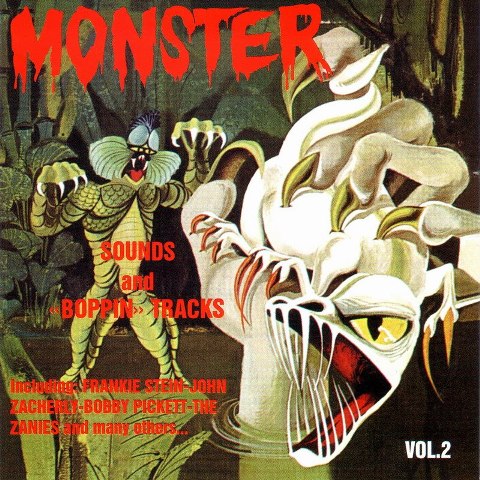 Next up is the first of two volumes called MONSTERS SOUNDS AND “BOPPIN” TRACKS. This import (from Brussels) features 22 tracks and is worth tracking down if you can find it. Occasionally copies do appear on eBay and they are alot of fun and include tracks found no where else. Some of the songs on this volume that stand out are “Lullaby Of Ghost Land” by Frankie Stein, “The Spook” by The Tomko’s, “Strange Happenings” by Rex Garvin, “Graveyard Shift” by Bobby “Boris” Pickett, “Dinner With Drac” by John Zacherley and “The Monster Swim”, another variation of “The Monster Mash” by Bobby “Boris” Pickett.