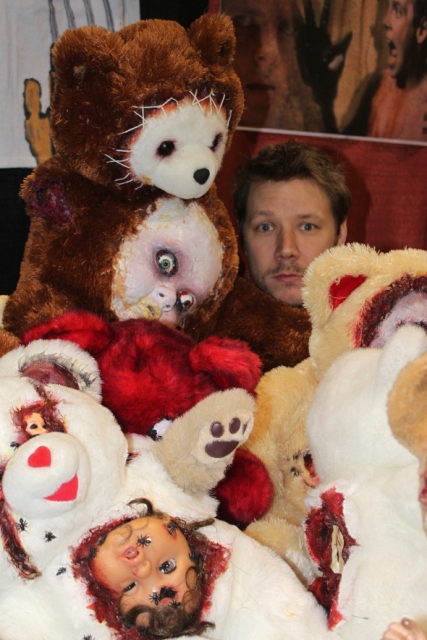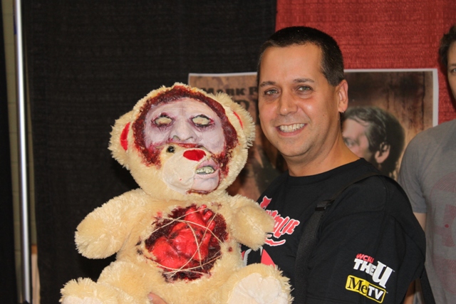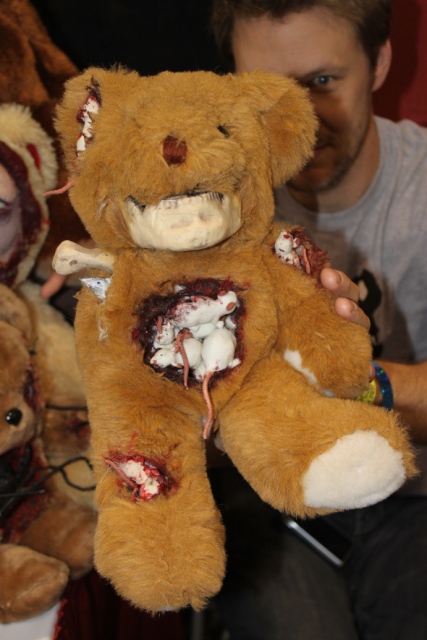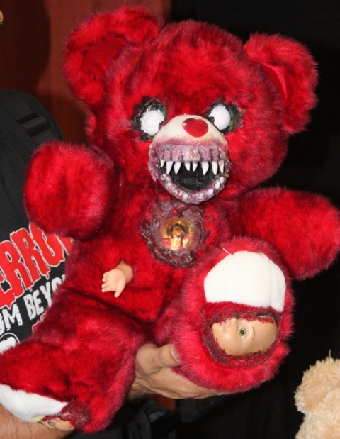 As mentioned in our first ROCK N SHOCK story, the best items for sale in the dealer’s room this year were custom made. Of all these wonderful creations, none showed the shear genius and warped creativity of QuiET RoOM BeARs! Children afraid of the dark or the monster in their closets will have to seek alternative forms of comfort aside from clutching their Teddy Bears so far as Lee Howard is concerned. The Canadian artist not only came up with his own line of horror Teddy Bears, he’s managed to make each and every one completely unique and individually numbered….