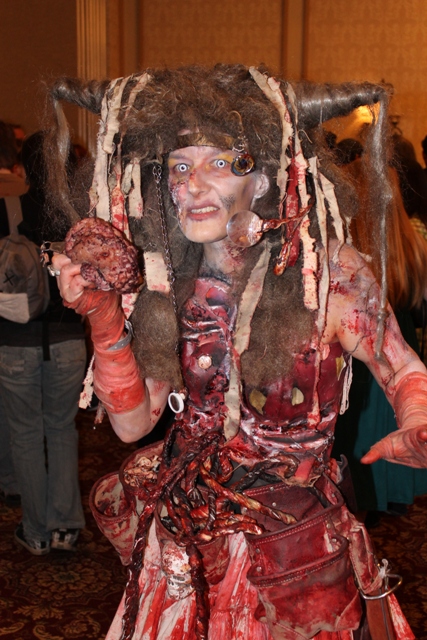 In many ways this event reminded me more of the FRIGHT NIGHT FILM FEST I’d attended last July (see story HERE) than previous Horrorhounds. The rooms were spread out and, if you weren’t careful, you might miss something. Opening nights are usually the best times to conquer fan conventions but both David and I remarked that this was one Friday that appeared busier than most Saturdays. We decided to walk around and familiarize ourselves with our surroundings, while snapping away at the various monsters (fans) that always add so much fun to these occasions.