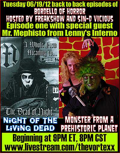 Peterson not only hosts the Madison Horror Film Festival (See coverage of last year’s event courtesy of our pal, Thomas Berdinski, by clicking HERE) but also his own show via The Vortexx each week. Fans of Mephisto owe Peterson a huge debt of gratitude for making his collection of Mephisto’s classic shows (“Lenny’s Inferno“) available each week for free on this 24 hour online Channel. Freakshow’s own show “Bordello of Horror” follows.