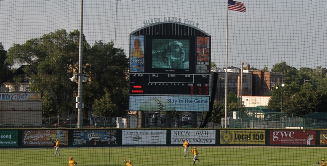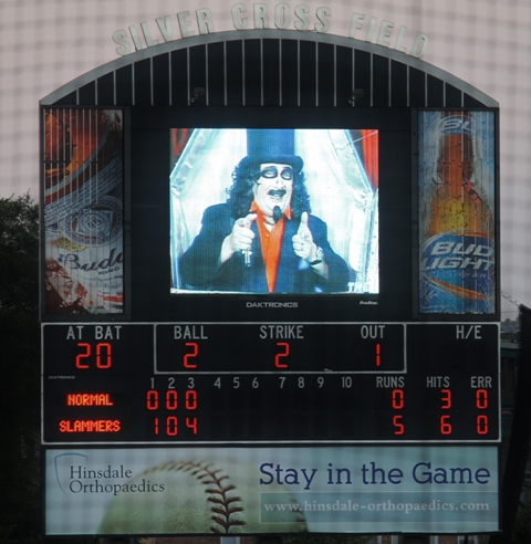 Joliet is famous for its prison (the older version of which was featured in THE BLUES BROTHERS which we passed en route), hence the name of their Minor League team, “The Joliet Slammers.” Further embracing their penal heritage, the stadium was adorned with posters featuring their jailbird mascot along with taglines urging their fans to “get convicted.”