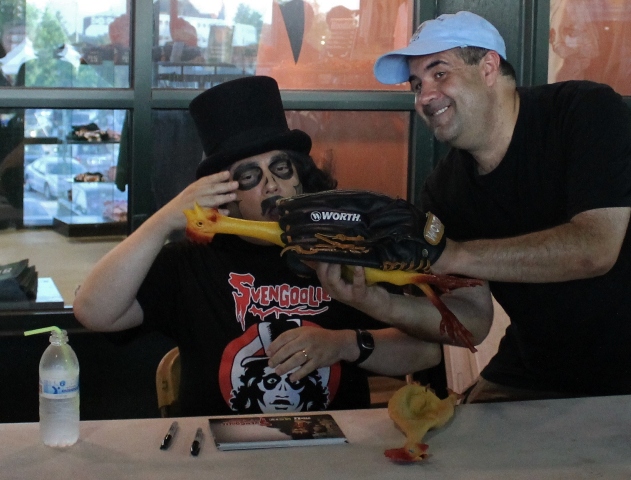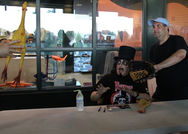 No doubt having learned from his recent engagement at the sweltering “Little Boots Rodeo,” Svengoolie showed up wearing a decisively cooler ensemble. Clad in his current Svengoolie T-Shirt (which you can order by clicking HERE), he and his assistant, Jim Roche, were prepared to combat the heat. He no sooner arrived when I jumped in his line faster than if I’d been trying to steal home plate! At last I’d be able to put all that rubber chicken catching practice to the test! Now I could do what any other die-hard Sven fan would; protect his host by intercepting his customary, poultry projectile! Later, I would bust a gut laughing at these shots as I noted Svengoolie’s hilarious facial expressions; which ranged from mock terror..to relief..and eventual gratitude. When you see Sven as often as I do, coming up with photo gimmicks becomes a sort of game in itself and its nice to see that Sven is always up for the challenge despite not being forewarned of my goofy ambitions!