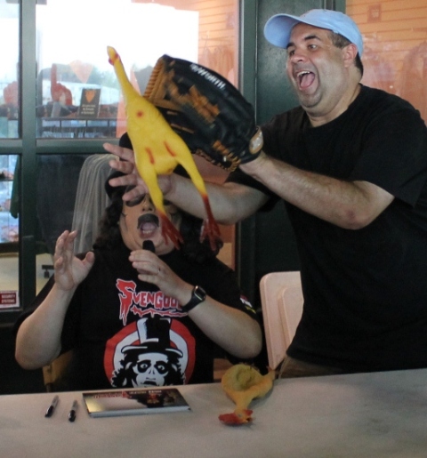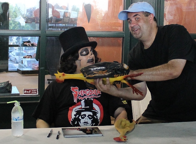 Further down was Nikki’s pal, Michelle, who waited patiently while her decisively less enthused hubby stood close to Sven’s table, drinking beers. According to Michelle, this was his way of making sure the line was moving fast enough. Prior to their leaving, Michelle had taunted him by wearing a form fitting outfit designed to grab the host’s attention (while simultaneously irking him). When it was almost her turn, I gave Jim her name so that he could help give her a more personalized Svengoolie greeting. “She’s the one wearing the brown shirt,” I told Jim. “Wait, which one?” he inquired. Suddenly Michelle’s husband jumped between us and sarcastically yelled, “The one with the BOOBS!!!” While Michelle shot daggers at her spouse faster than the rubber chicken I’d just caught, Jim didn’t skip a beat. “Well I’m not sure what you mean because usually when people talk about boobs, they’re referring to me and Sven.”