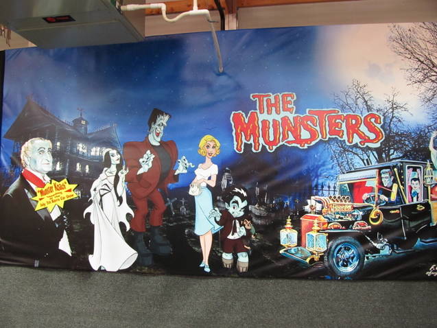 The line to see Mr. Barris was flanked by Oh, such wonders to my eyes! To the left was “Drag-u-la” which fans will remember was created by Grandpa Munster so he could win back the “Munster Coach,” which Herman had lost in a drag race. “Drag-u-la” also made an appearance in MUNSTER, GO HOME when Herman drove it cross country race. A little beauty, the body of the car is a gleaming gold coffin with organ pipes on each side, and a plastic bubble under which the driver would sit.