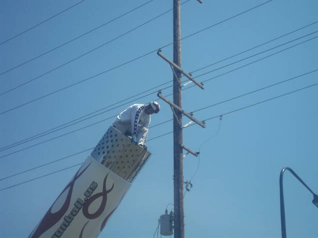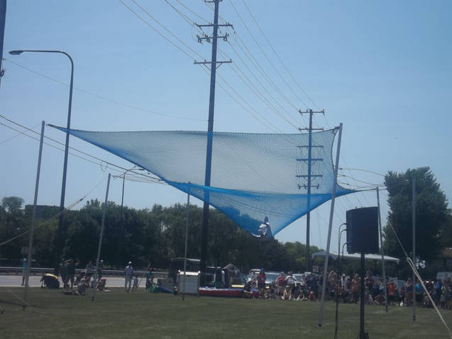 Dave Smith, Jr. also told the crowd that his father once held the world record for the longest distance traveled by a human cannonball, and, ever since, “that record has never left the family.” The crowd looked on as Mr. Smith proceeded to check the blue netting on which he planned on landing, to make sure it was neither too loose (which could cause him to hit the ground) nor too tight (which could cause him to bounce right off of it and hit the ground). Satisfied with what he observed, he returned to the cannon, and stood on it as it was raised into the air. Once the cannon was at the target angle, Mr. Smith donned his helmet, and climbed inside.