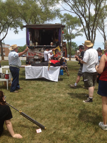 However, neither snow nor rain nor heat nor any other type of strange Chicagoland weather will keep Svengoolie from meeting his fans at an appearance, nor will it dampen his spirits. The Rodeo did provide Sven with a fan (the electric kind) to keep him cool, but still, it could only accomplish so much. Kudos to Mr. Goolie for sticking it out both days and being as nice as ever to your fans! And there were a lot of fans who came out to see him, despite the heat!