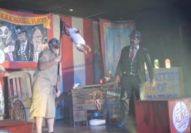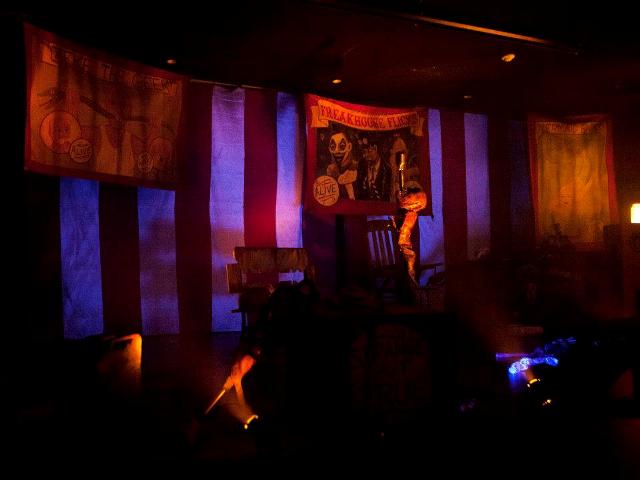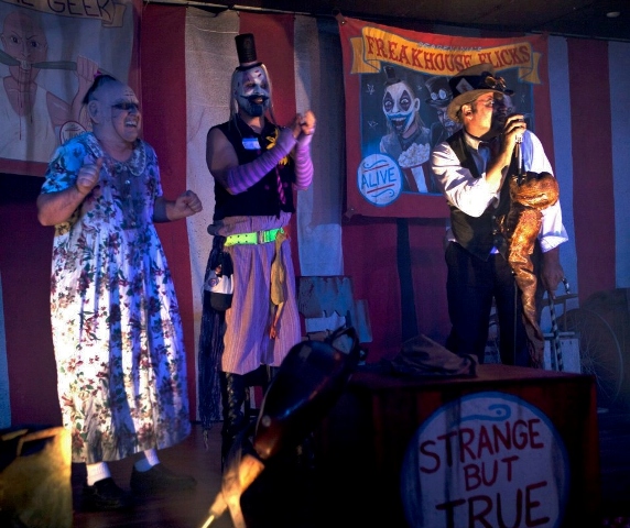 The creepy crew of Scarevania’s Freakhouse Flicks made their live stage debut July 21st at The White Rabbit Cabaret in Indianapolis, IN. As the patrons made their way to their seats they were greeted by a stage scene depicting the inside of a “10 in 1” sideshow tent. As the house lights went down, the evening was kicked off by carnival talker (and leader of the Freakhouse Flicks gang) Francis D. Pickles!