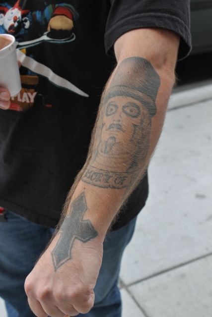 Anticipating a long line, I arrived 90 minutes early. At that time it was humid as hell and there are two things you can guarantee regarding me and humidity; I will sweat like a beast and what’s left of my hair will immediately kink up. By the time Sven arrived I looked like I’d been carving gyros in back of a Greek restaurant all day. I was joined by my friends, Ron and Angela Urban (whom I’ve written about before) and talking to them, helped keep my mind off the fact that I was really uncomfortable. Before the signing started, I walked down the line looking for my friend, Joan Yingst, who said she was coming too. One thing I’ve learned from this past month…Svengoolie appearances are to a fanboy what cocktail parties are to rich folks; great social events! I couldn’t find Joan but came across a guy named Chuk Barsick from CarnEvil Filmz who showed off his awesome Sven tattoo.