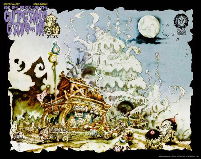 Well I’m happy to report that there is a new book out there that is NOTHING like the others and one we Monster dads (and moms) can cheer about! BAD-OFF BORIS AND THE CUPCAKE CAVE-IN, created & written by Scott Mallory and featuring artwork by Rob E. Brown, is the perfect addition to your child’s home library (even the bottom of my closet) and a MUST-READ this Halloween season!