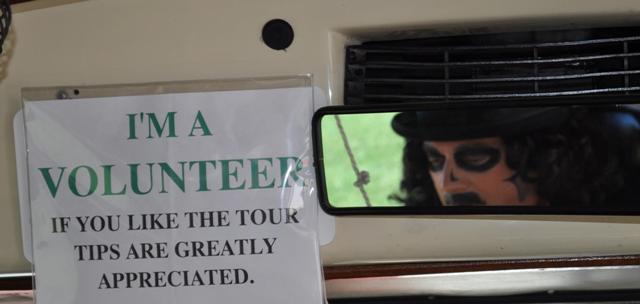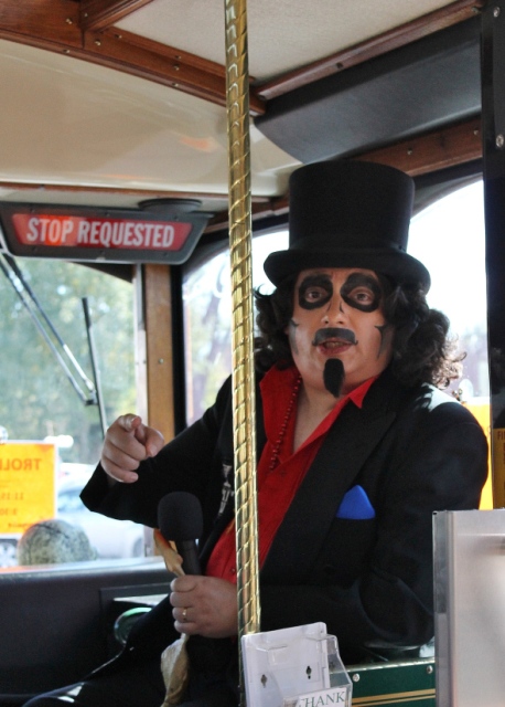 The signing ran a bit late, delaying the trolley rides. While we waited our turn, we bumped into yet another super fan, and Terror Dave favorite, Jamie Lee Cortese! It turns out she also had tickets for the second trolley ride making this tour seem like a ride on the Svengoolie/Partridge Family bus! We eventually boarded with Svengoolie sitting in front next to Liz, the driver/narrator. You can’t say we weren’t driving in style as this trolley was a $270,000 replica of a 1915 Victorian model!