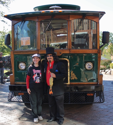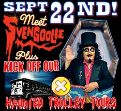 After 33 years, Svengoolie has risen to the height of Horror Host achievement by not only staying on the air in today’s less than host-friendly commercial TV world, but by going National via MeTV early last year. He’s a legend, and a busy one at that. I’m not too proud to admit that the man can run circles around me with his daily blogs, show tapings, and year-round appearances. Thank Heavens I’m not alone in my fanaticism and can count on some great fellow Svengoolie fans to help me keep up! Angela Urban (whom I’ve written about before and has provided past coverage of events) was kind enough to not only notify me of this appearance, but also give me a not-so-gentle nudge to hurry up and buy my tickets for Svengoolie’s “Haunted Trolley Ride.” This was a special feature added to his Volo appearance and absolutely something I wanted to do. I’d already missed my chance to get tickets for his first scheduled ride and immediately took advantage of a second one that was added later.