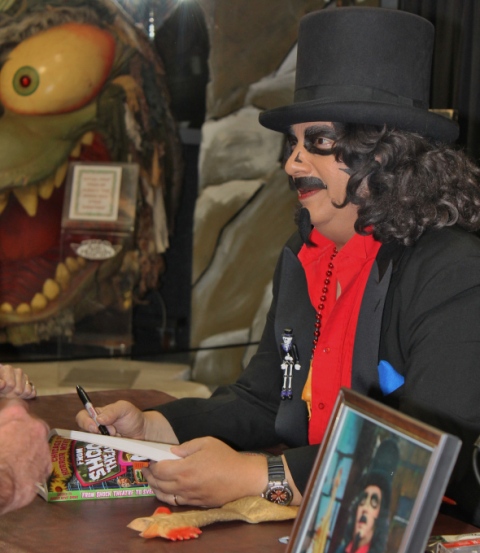 I watched numerous fans light up having finally met their favorite horror host! As with all Svengoolie signings, some stand out more than others and this was to be no exception. I noticed Sven sign a woman’s hand and decided it warranted further investigation. The woman’s name was Valerie Ahrens and she said that her original plan was to have Sven sign her “boobs” but she accidentally wore a turtle neck (???). Incidentally, if there are any over zealous gals out there reading this blog and considering Valerie’s idea, I believe that Sven is a family man and that this is NOT an option (and if it is, as a childhood fan, I don’t want to know about it!). In lieu of not being able to achieve her primary goal, Ms. Ahrens opted for a Plan B. She asked Sven to sign her hand along with adding his home phone number. She proudly showed me her palm and it distinctly read, “Svengoolie…588-2300.” Chicagoans will instantly recognize this as the famous phone number for a local business called “Empire Carpets.”