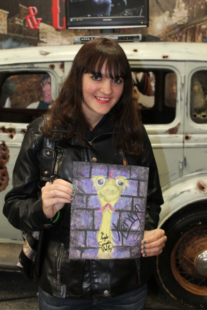 Svengoolie’s sidekick, Kerwyn, apparently also has a following as illustrated by a young fan named Angela Zarek who brought some of her own artwork paying homage to the prehistoric rubber chicken for the host to sign…