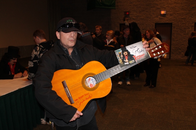 I noticed a fan having Sven sign his guitar and felt that warranted further investigation. Of the many interesting things I’ve seen brought to a Svengoolie signing, this was a first for me. Steven Styll had been a fan of Sven’s since he was a child back in those “Son of Svengoolie” days. I know I had seen shots of the first Svengoolie (Jerry G. Bishop) with a guitar and wondered if this was yet another unearthed treasure from back in the “Screaming Yellow Theater” days (like that seen at G-FEST & covered HERE). My hopes were quickly dashed when I discovered that this was far from the case.