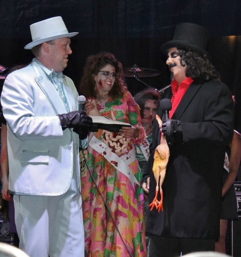 Looking as if she’d just crawled out of her grave, the winning ghoul strutted her stuff (while holding an amputated limb) as Svengoolie did one of the things he does best; performed a parody song. Sven wrote the lyrics after Elizabeth Haney suggested the idea to him. I’m so glad she did since this represents the first time I got to see Svengoolie sing “LIVE” (I’m not counting that “Take me out to the Ball Game” he did at The Slammers game in July) even if for the dead.