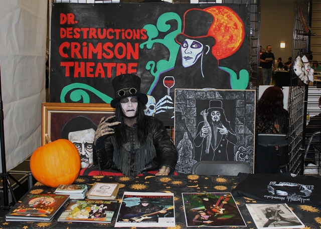 After Brian was settled, I took a walk to see the layout. I found my friend, J.D. Feigelson, sitting at the VCI table and heard they did quite well. I then set out to find the horror hosts. Unlike last year, the hosts were intermingled with other vendors in a room adjoining the main hall. Wisconsin PA host, Dr. Destruction, had been texting me about my whereabouts throughout the day and his sidekick, Eyegore, helped me navigate a better route than my GPS provided. I found him sitting at his booth which was much more elaborate than the one he had last year.