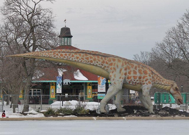 This is not the first duck-billed dinosaur to grace this zoo, however. His smaller cousin, “Archie” the Anatosaurus (formerly called a Trachodon), has been standing (albeit, standing incorrectly “straight up”) over by the zoo’s Indian Lake since the year I was born (1970). It had been part of a group of fiberglass dinosaurs featured in 1964’s New York World’s Fair before being donated to the zoo.