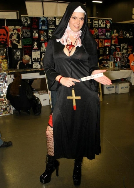 After finally making it to the main floor, we found Dr. Destruction decisively more drunk and having trouble keeping balance. Apparently he’d gotten a hold of that guy’s moonshine which the man had brought over to share with his female friend, a tall model dressed in a bloody nun’s costume named “Bella Demente.” The guy later told me he was offering his brew to Bella before it got snatched away by Dr. Destruction. Dr. Destruction’s version? “That damn 7 foot nun messed me up with that moonshine of hers!!!”