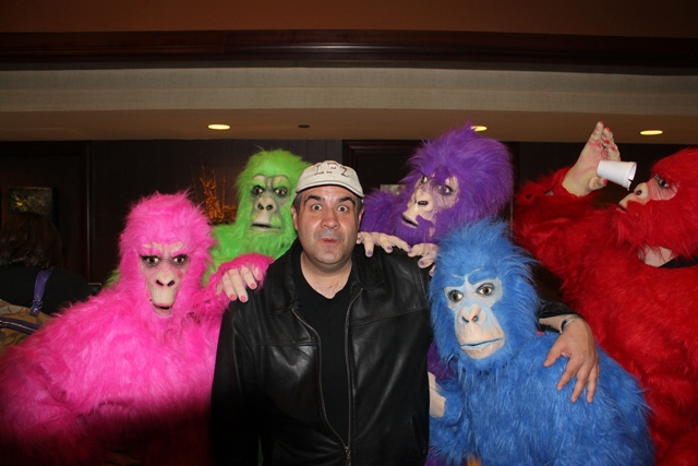 Russ and I finally got our drinks and schmoozed around while taking more pictures. Though the conditions were rife for seeing “pink elephants,” we started seeing gorillas instead; pink, purple, red, blue, and green ones! A group of technicolor primates casually strolled into the lobby, prompting Russ to grab my arm and ask, “Dave, are we seeing the same thing or am I drunker than I thought!?”