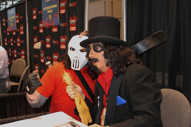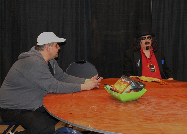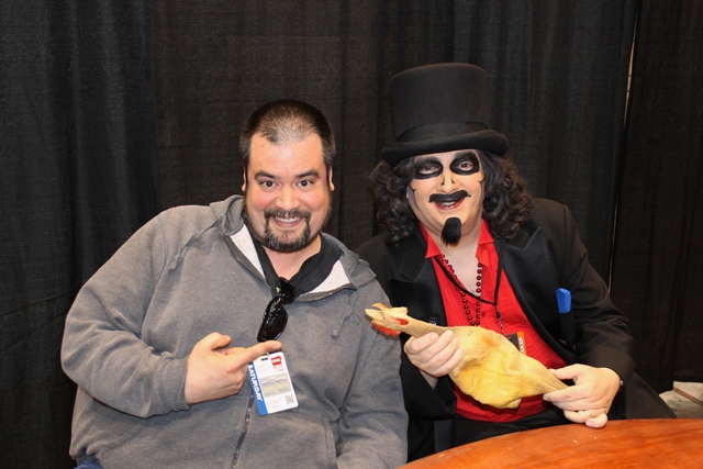The celebrities attending C2E2 were all sharing numbered tables at specific times. Svengoolie was slated for 4pm at Table 12 and, by the time we arrived (just under an hour before), a line had already formed. Fortunately, that would not be a concern for us today. Svengoolie and I had pre-arranged to meet ahead of time as there was some unfinished business from Horrorhound Weekend we had to attend to. Aside from that, his crew and I have built a rapport over the past year and they’ve been graciously allowing me to stay with them. I guess this sort of makes me like the Dian Fossey to their mountain gorillas; not officially part of the troop but permitted to hang with them none the less (and if anyone else out there compares Sven & company to gorillas I’ll smack em!).