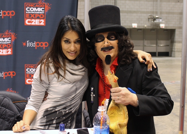 Later on, Sven asked if I’d approach actress Janina Gavankar from True Blood (seated a few tables down) to see if he could have a word with her after signing. I love True Blood and this was one request nobody had to twist my arm for. Ms Gavankar was born in Joliet, Illinois and attended The University of Illinois in Chicago. As a native of The Windy City, it was likely she knew of Svengoolie.