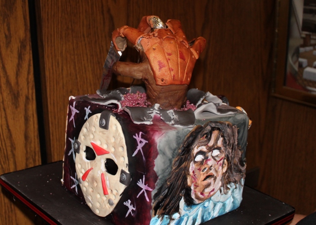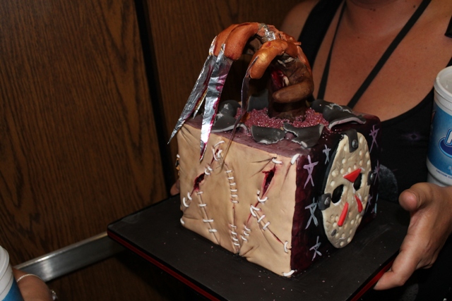 It turned out to be a cake…brought all the way from England! How this enthusiastic Brit (who brought it along for no other reason than to celebrate the convention with her US pals) kept it in one piece was amazing to me! The cake featured iconic horror characters such as Friday the 13th’s Jason, Linda Blair, as well as A Nightmare on Elm Street’s Freddy Krueger’s glove popping through the top…