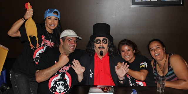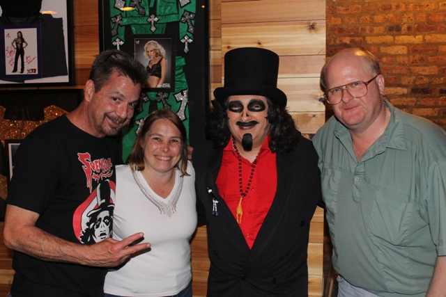 Surprisingly, we weren’t the first Svengoolie fans to arrive. On the other side of the bar was a small gathering of pals whose lone female gave them away by wearing a pair of rubber chicken earrings. We’d never seen them before and they explained that this was their first time meeting him.