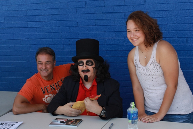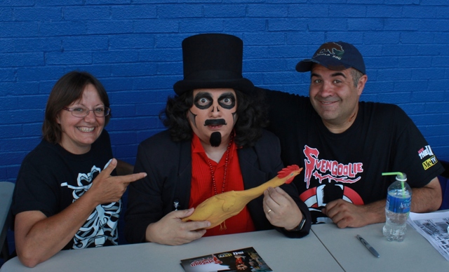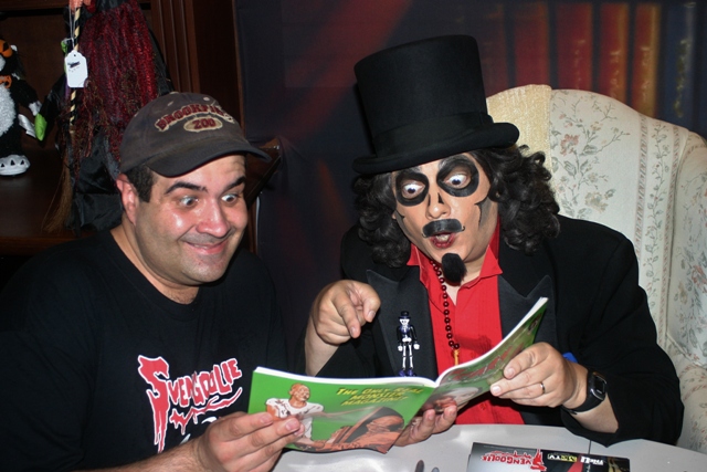 #2) Svengoolie has a sidekick. While Tombstone, Kerwyn, and Doug Graves may share TV time with Sven, there’s but ONE who stands out during his public appearances. Jim Roche not only assists Svengoolie during the majority of these occasions but totally enhances them! He’s as quick-witted as the host and, with the two volleying comments back n’ forth, like witnessing an unscripted show. Jim has the uncanny ability to keep track of everything going on in the signing area, cutting immense fan lines (when necessary) with pin-point accuracy to match the signing schedule, while also interacting with both Svengoolie and his fans simultaneously. He accomplishes all of this while never breaking the most fundamental sidekick rule..compliment your horror host but NEVER upstage them.
