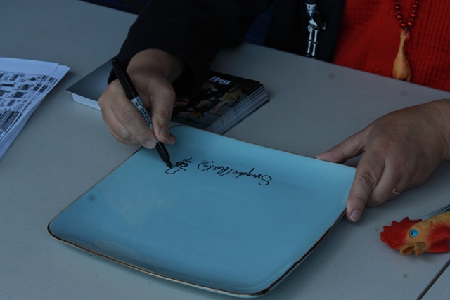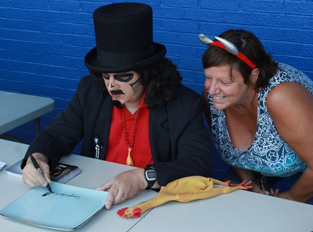 #14) He’ll sign anything! I’ve seen the host handed DVD’s that have nothing to do with him, boxes of Count Chocula cereal, and last weekend…a plate! It was great seeing an old friend from a 2011 appearance named Donna Sweeney who, not having anything to sign back then (at Ultra Foods covered HERE), grabbed a can of corn from the aisle she was waiting in and had him sign that! Apparently, finding creative objects for Svengoolie’s signature is hereditary as her sister, Laura, showed up this time around and had him sign an ordinary plate! I should probably mention that only does Sven sign for free, he also offers free promo cards to sign so ransacking the kitchen cabinet is not necessary.