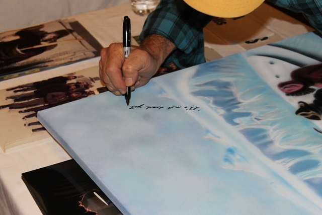 During the course of the evening, a woman walked by and lit up when she saw Russ’ painting. Sensing her level of interest, I then witnessed my friend undergo an uncanny metamorphosis! In fact, had he been an Alaskan Malamute, his face would have spilt open revealing one savvy salesman beneath. He’d not only quickly tell her the painting was for sale but, without skipping a beat, quote her a price while mentioning the rarity of it being signed by so many cast members. Needles to say, it now belongs to Ms Deardra Rivera and is hanging in her Seattle home.