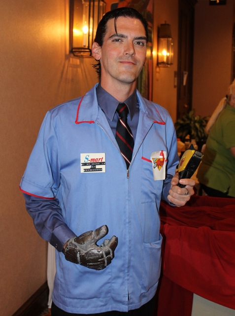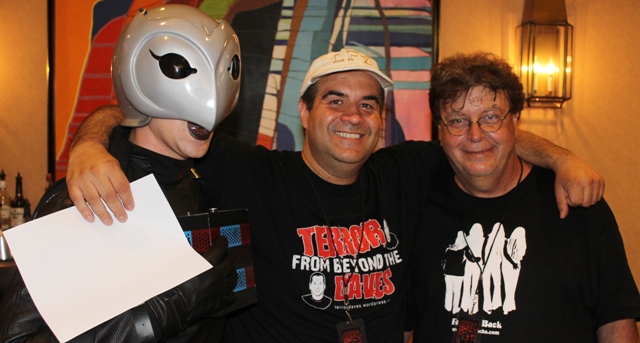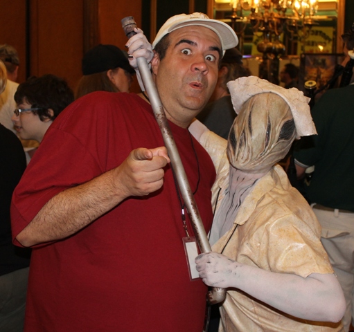 Having met our goals, we said “Goodbye” to THE THING folks and then headed over to hotel restaurant for a special errand. Russ has a friend named Missy who assists Tony Todd at events and both were present at this one. Via Missy, Russ was able to show Todd his drawing of The Crow (Todd played a character named Grange in the movie) and he loved it. He also wanted to snap some picture of Russ’ “Norris Monster”…the only one of his creations that made it back to Chicago.