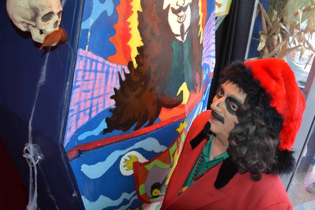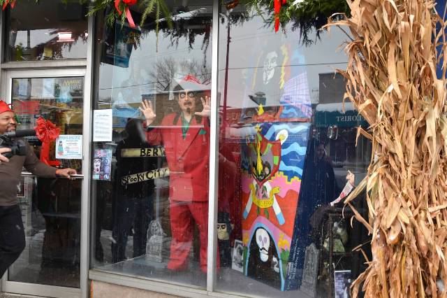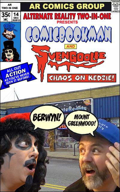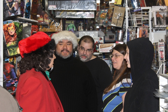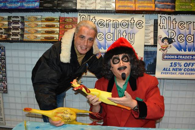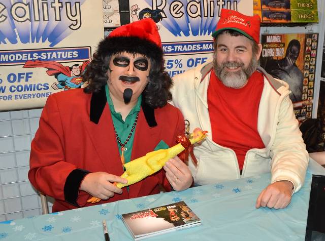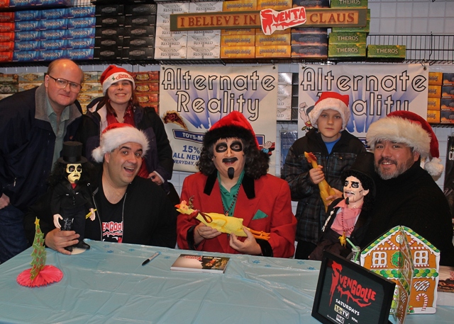 The next weekend, Svengoolie would return, this time appearing at Alternative Reality Comics in Mt Greenwood: a shop owned by a man named Tim Davis. Davis is pals with my fellow Goolie, Brian Bernardoni, and it’s his store window that hosts Brian’s amazing Svengoolie coffin & props when not being utilized for Brian’s Halloween yard haunt (and you can check out that fantastic set-up by clicking HERE). At last our mutual idol would get to see Brian’s great work in person which I know had always been a dream of Brians. It also gave the world another opportunity to meet Sventa Claus…the first ever outside of Comic Collector.