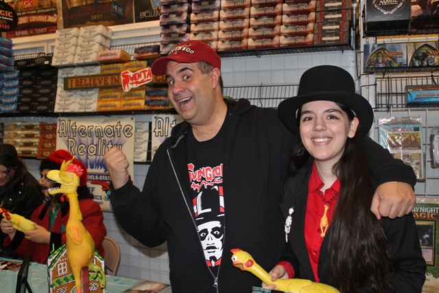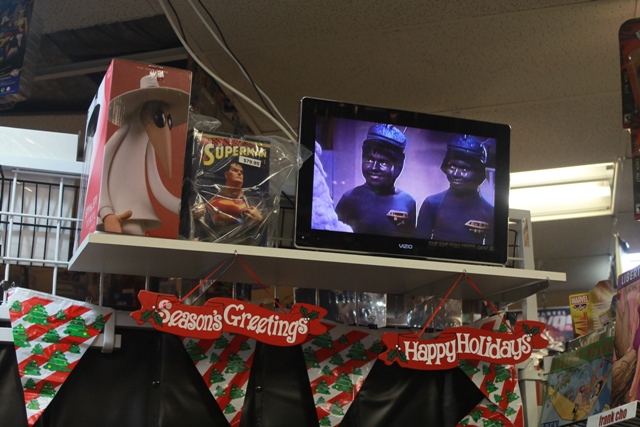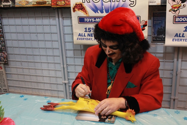 I’d left the sign in the back room awaiting Svens arrival but, during the time I was looking over the place, one of the crew nabbed it and hung it over Svengoolie’s signing area. It was now too high to be effective for any photographs I had planned but it was nice that everyone got to enjoy it (and thankfully those hooks they added were easily removed lest my mom club me with it). It was also too tight and crowded for me to get to my bag (also in the back room) and put bows on the dolls and chickens – especially with me being way back in line (which somehow managed to happen despite my being one of the first to arrive). It was neat that Tim had Santa Claus Conquers the Martians playing on a TV above to help entertain us while we waited (Tim, remind me to burn you a copy of Sven’s presentation for next time).