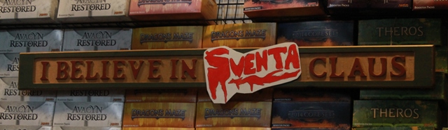 Like my previous Sventa encounter, I brought along props which included a sign I’d taken from my mom that said “I Believe in Santa.” I tried to sneak it away from her but she totally caught me. After considerable pleading, she finally agreed to let me take along with the promise I’d bring it back in one piece. Just before this event, I bought some Crayola markers and made a “Sventa” logo to cover the Santa portion of the sign (Brian’s wonderful wife, Carrie, brought duck tape as a last minute request to hold it on).