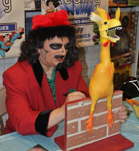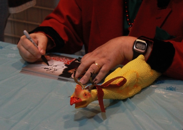 One fan brought along a living chicken who’d last paid Sven a visit at the Ultra Foods Store in Chicago Heights, Illinois back in 2011 (as I type this I’m puffing on an imaginary pipe and saying, “Ah yes…I remember that Sven appearance as if it were yesterday….”). Sventa asked Jim if he wanted a picture with the chicken. “No, no,” said Jim. “I’m no longer allowed to take any pictures with livestock!”