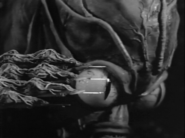 Though they are called little green men in the film, and all color posters and lobby cards feature the saucer-men colorized green, the actual color of masks were brown, which in my opinion, make them look even more evil. For 1957, this film featured two scenes of gore that you normally wouldn’t see. When the disembodied hand is moving around, there are strands of tendon and exposed bone clearly shown. During one scene where a saucer-man attacks Larkin’s bull, its eye is gouged out by the bull’s horn, in oozing detail. This particular scene was actually cut from many television prints of this film.