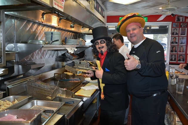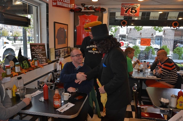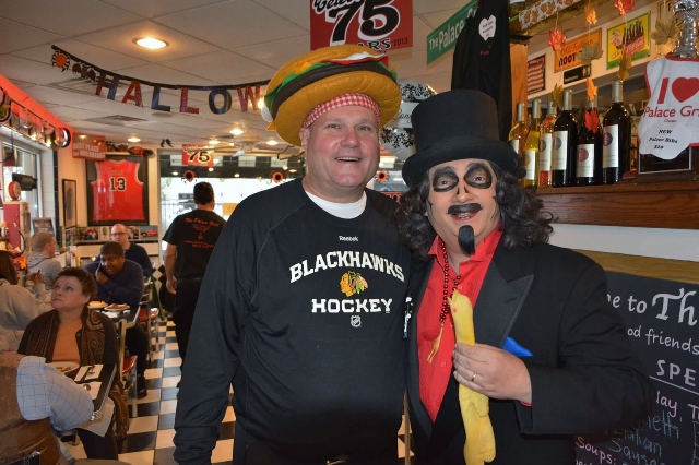 After leaving the station, Sven went to visit his friends, George and Christina Lamperis, at the “Palace Grill Sandwich Shop!” The oldest restaurant in Chicago’s West Loop, it’s a must-visit for any fan of The Blackhawks as well as those seeking the experience of great food in a vintage-style diner. On this day, lucky patrons got a true Halloween surprise as Svengoolie greeted them during their meal.